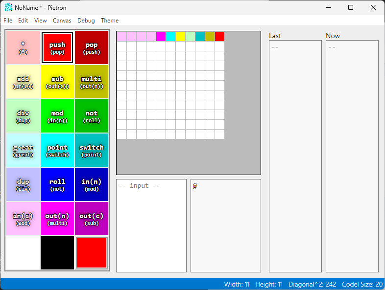 さて、いよいよ設計をもとにして Piet で描いていきます。今回は Pietron というソフトを使いました。