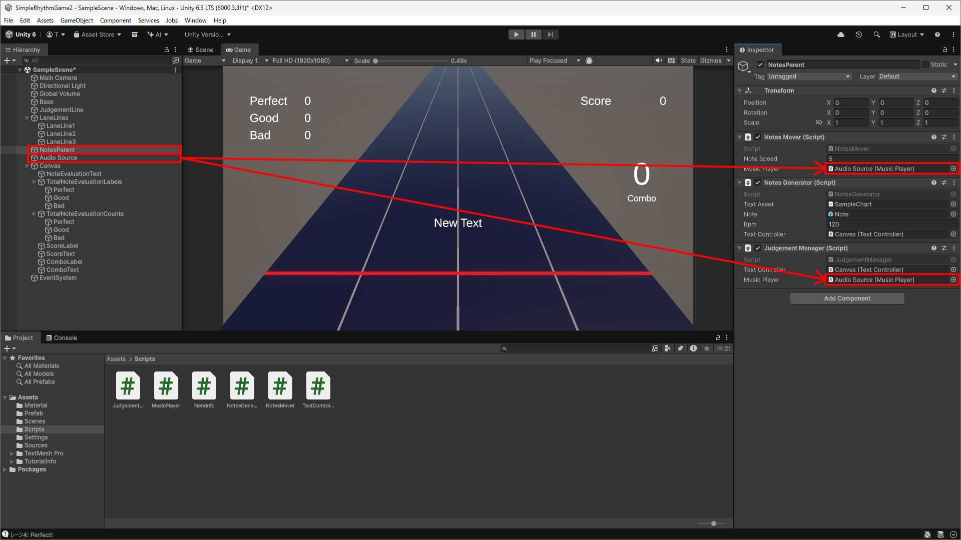 コードを書き換えたら、HierarchyウィンドウでNotesParentを選択して、InspectorウィンドウのMusic Player(NotesMoverとJudgementManagerの2箇所)にHierarchyウィンドウのAudio Sourceをドラッグ&ドロップしましょう。