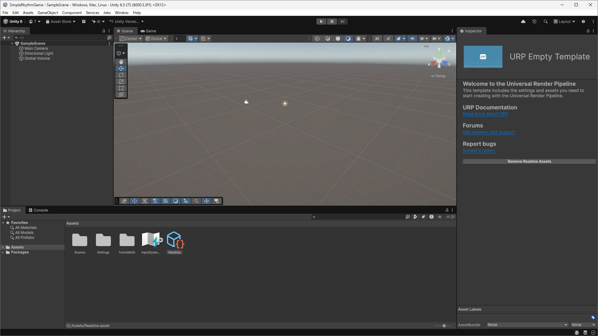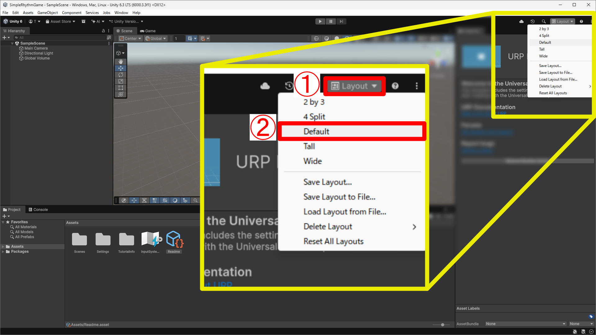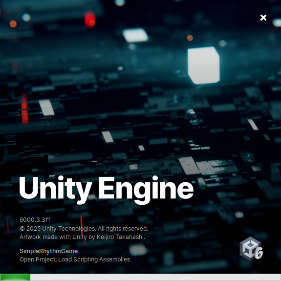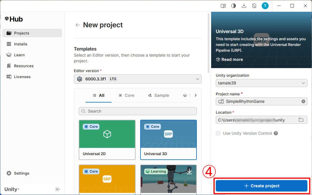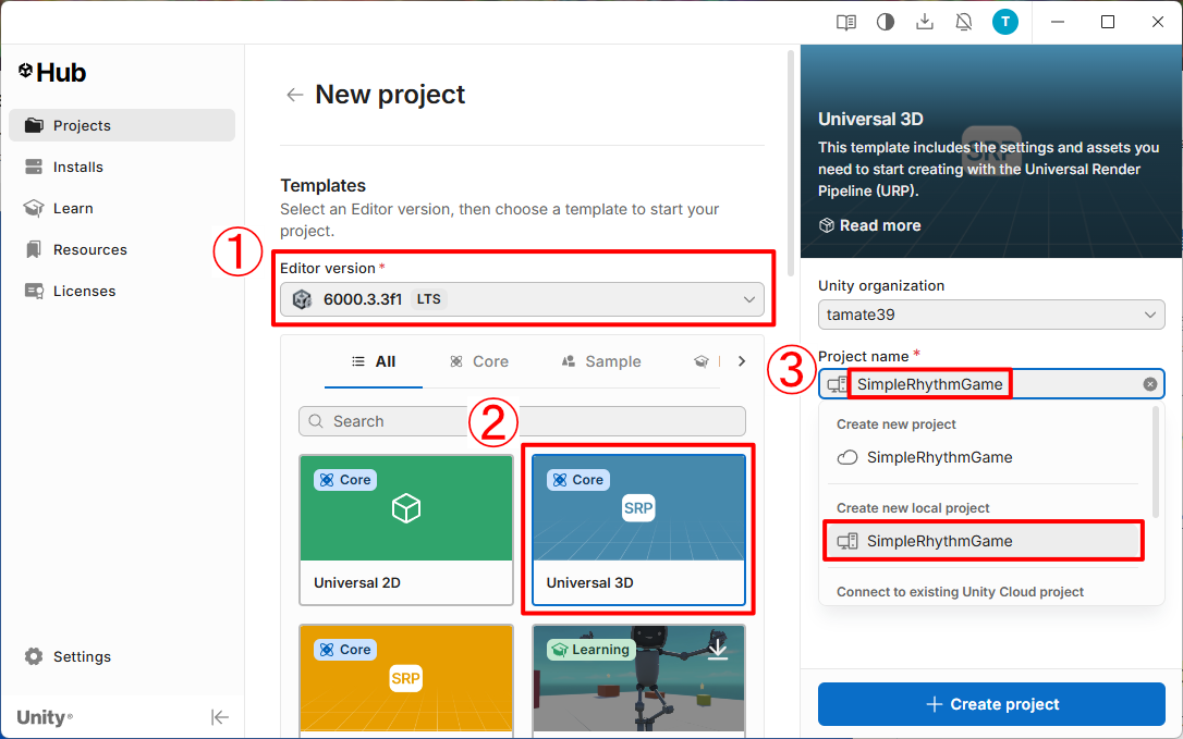 6000.3.○○f1となっているものにすることをおすすめします。 Universal 3Dが選択されていることを確認します。- プロジェクト名を入力します。今回は、「SimpleRhythmGame」としておきます。また、この際に