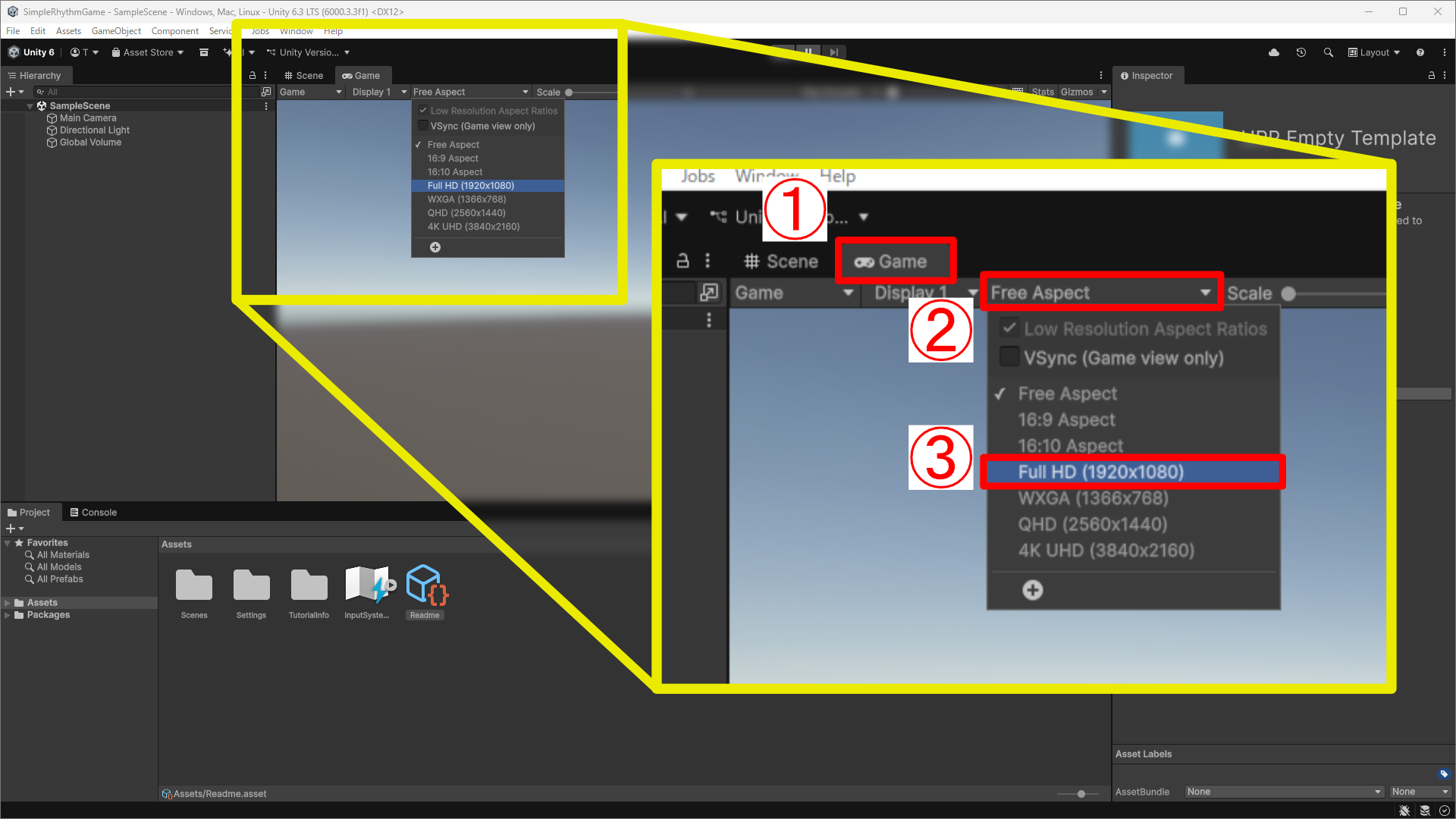 Gameと書かれたタブを選択してゲームビューに切り替えます。Free Aspectと書かれたメニューを選択します。Full HD (1920x1080)を選択します。