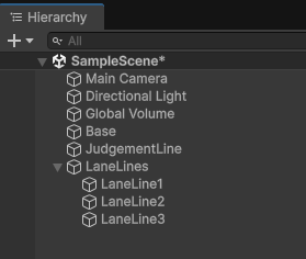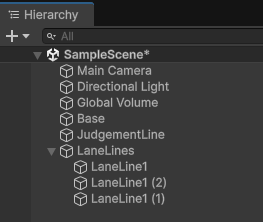 今回は4レーンのゲームにしようと思うので、線を3本作ります。この3本の線はグループとしてまとめておきたいので、LaneLinesという空のゲームオブジェクトを作り、各レーンの線をその子オブジェクトとして作っていきます。
