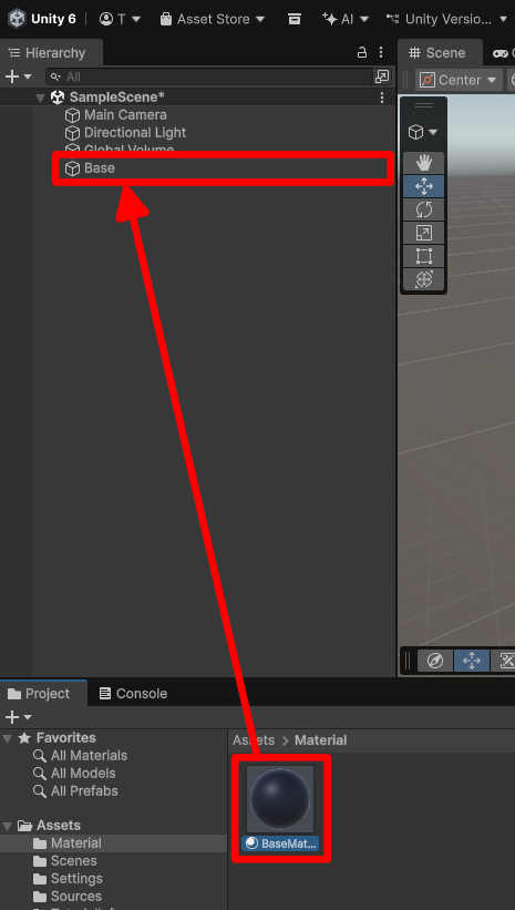 マテリアルを作成したら、オブジェクトに反映させる必要があります。ProjectウィンドウにあるBaseMaterialをHierarchyウィンドウのBaseにドラッグ&ドロップするとマテリアルが適用され、土台に色がつきます。