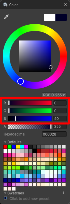 土台ですので、R: 0, G: 0, B: 40の暗めの紺色にしました。