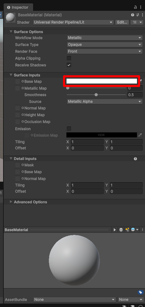 作成したBaseMaterialを選択し、Inspectorウィンドウからマテリアルを編集していきます。