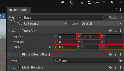 HierarchyウィンドウでBaseを選択し、InspectorウィンドウからPosition(位置)とScale(大きさ)の値を変えます。