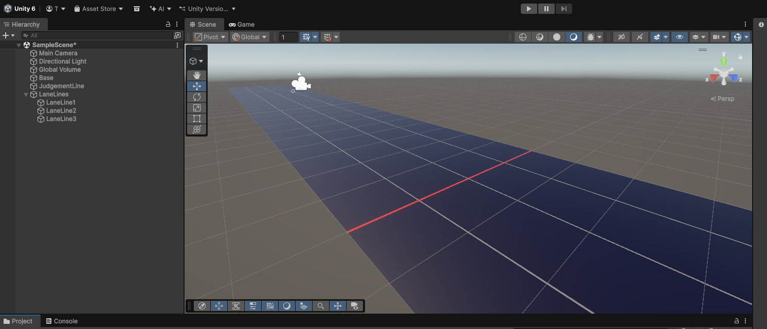Gameビューで見たときに土台と判定線、レーンの線がいい感じに見えるようにカメラを調整します。