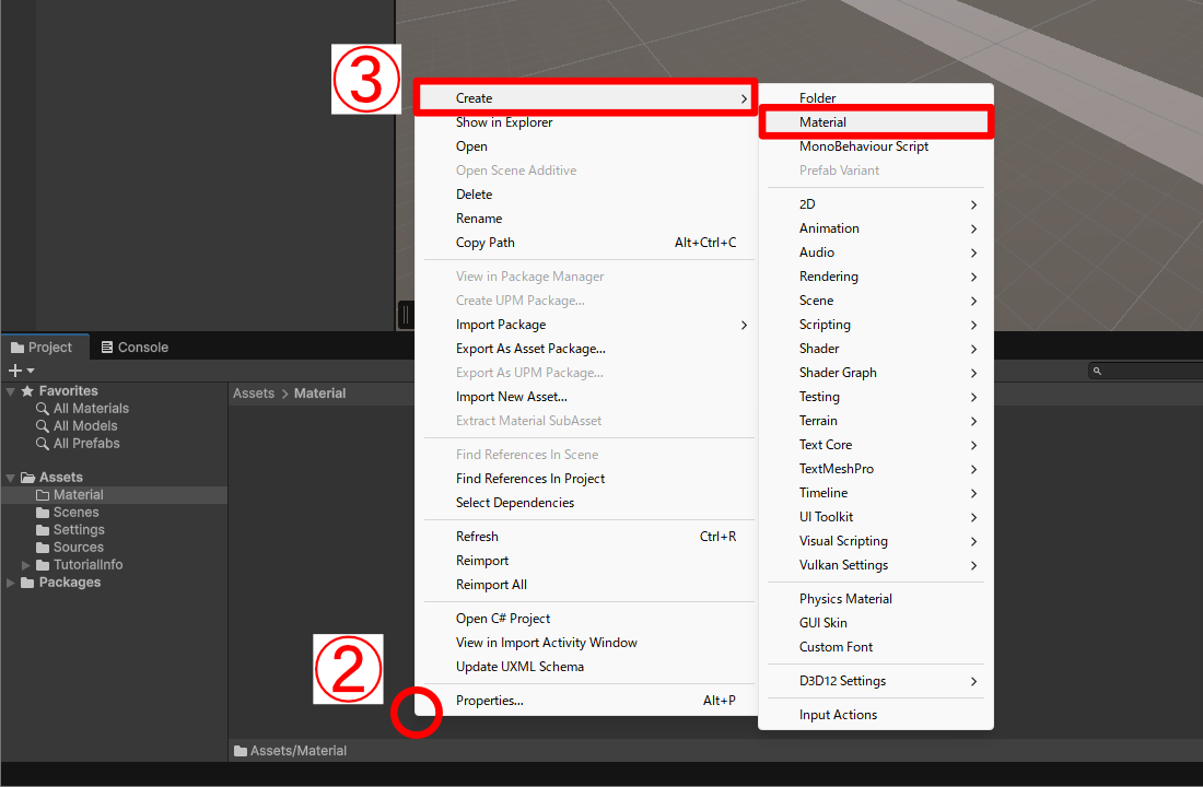 Materialフォルダをダブルクリックします。 Materialフォルダ内の空いている部分で右クリックします。Create>Materialを選択してマテリアルを作成します。