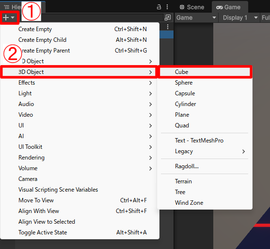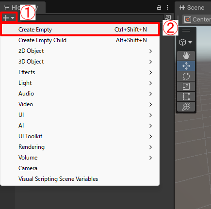- Hierarchyウィンドウの+マークをクリックします。