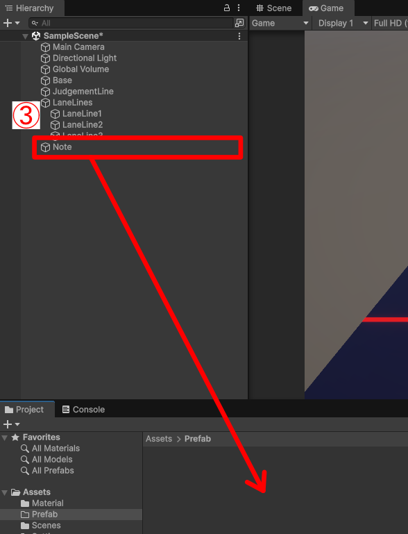 さて、ノーツは音ゲーをする際にはいくつも複製して使いますので、プレハブ化しておきます。