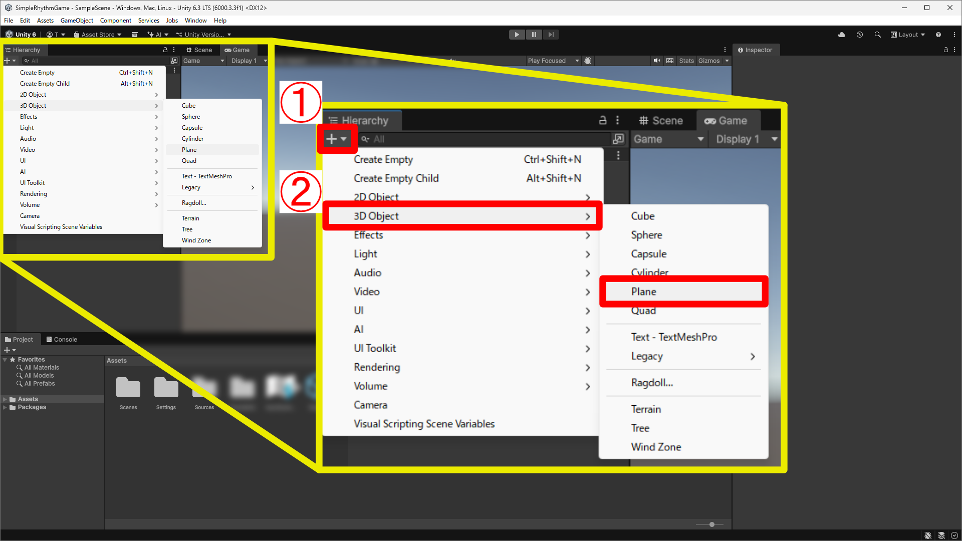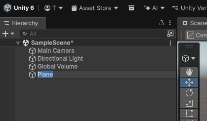 3D Object>Planeを選択してPlane(平面)を作成します。