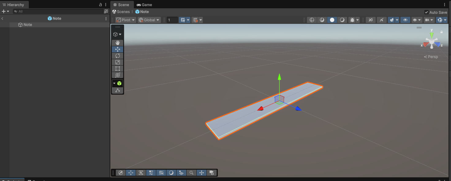 ProjectウィンドウにあるNoteMaterialをHierarchyウィンドウのNoteにドラッグ&ドロップするとマテリアルが適用され、ノーツが白色になります。