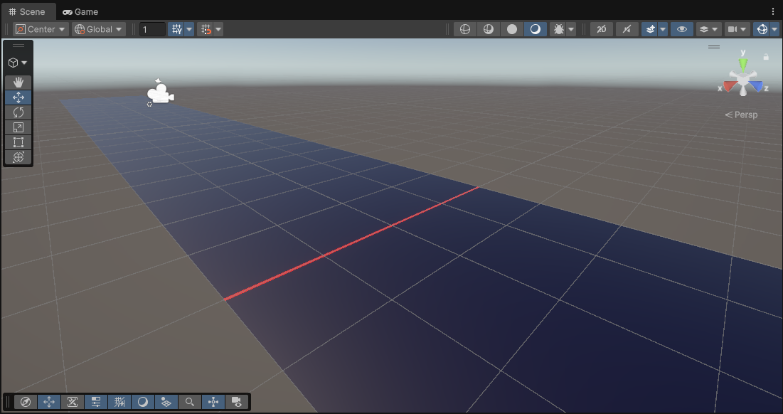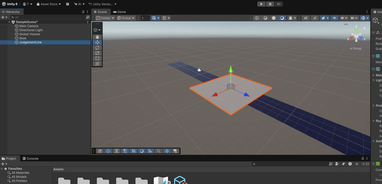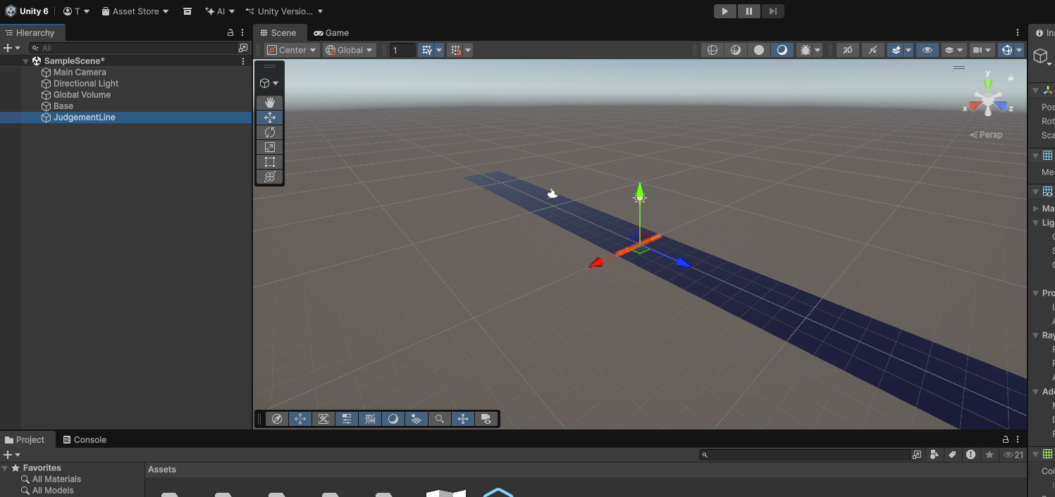 次は判定線を作っていきます。土台と同じように、Planeを作って位置と大きさを変え、マテリアルを作って色を変えていくという流れになります。