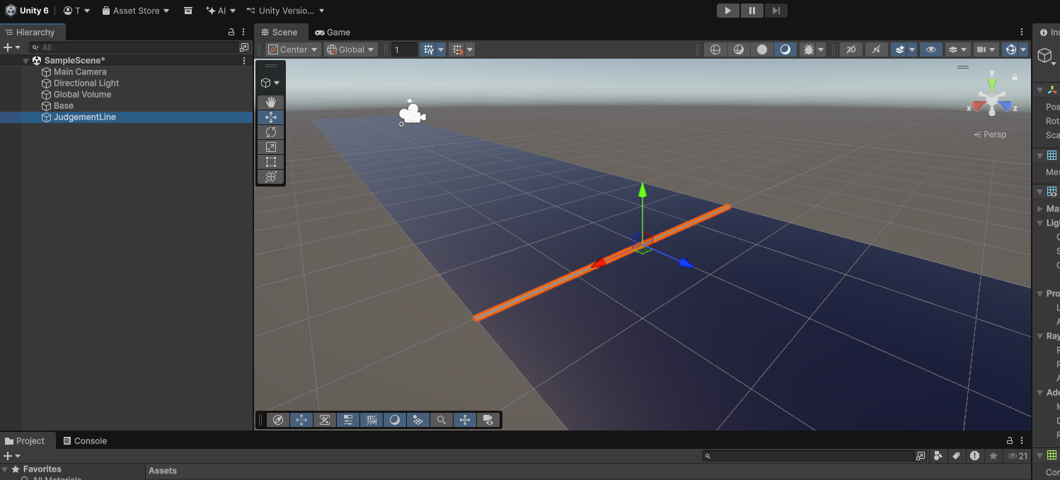小さいので拡大してみましょう。HierarchyウィンドウやSceneビューでJudgementLineを選択した状態でキーボードのFキーを押すとJudgementLineにフォーカスすることができ、見やすい大きさに拡大されます。