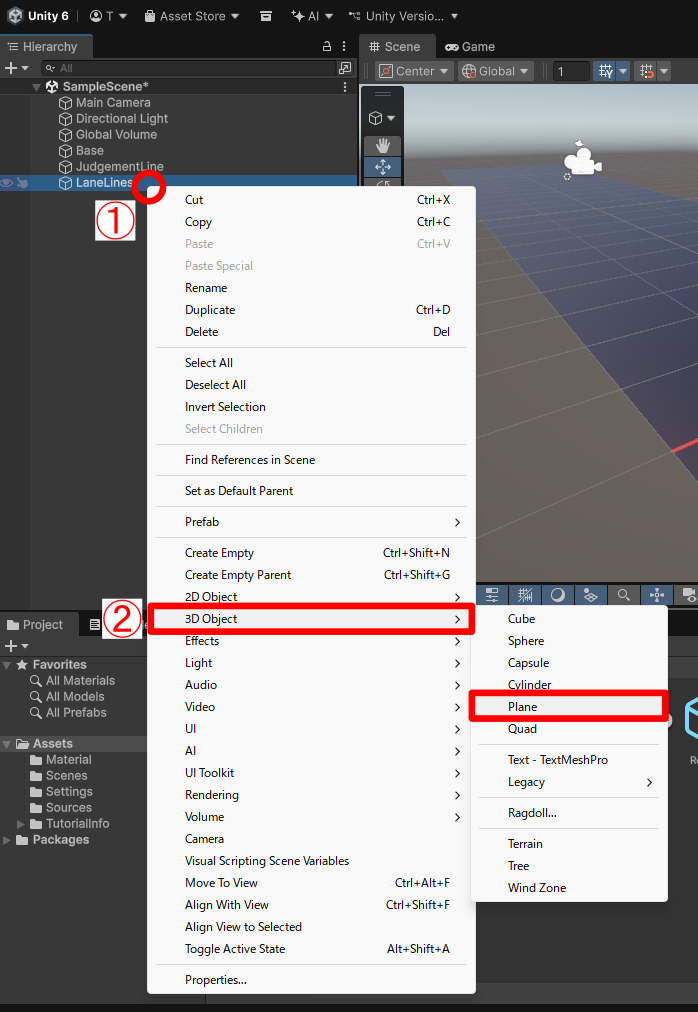 LaneLinesを右クリックします。 3D Object>Planeで平面を作成します。作成したオブジェクトのオブジェクト名はLaneLine1にします。