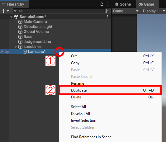 LaneLine1を右クリックします。Duplicateで複製します。